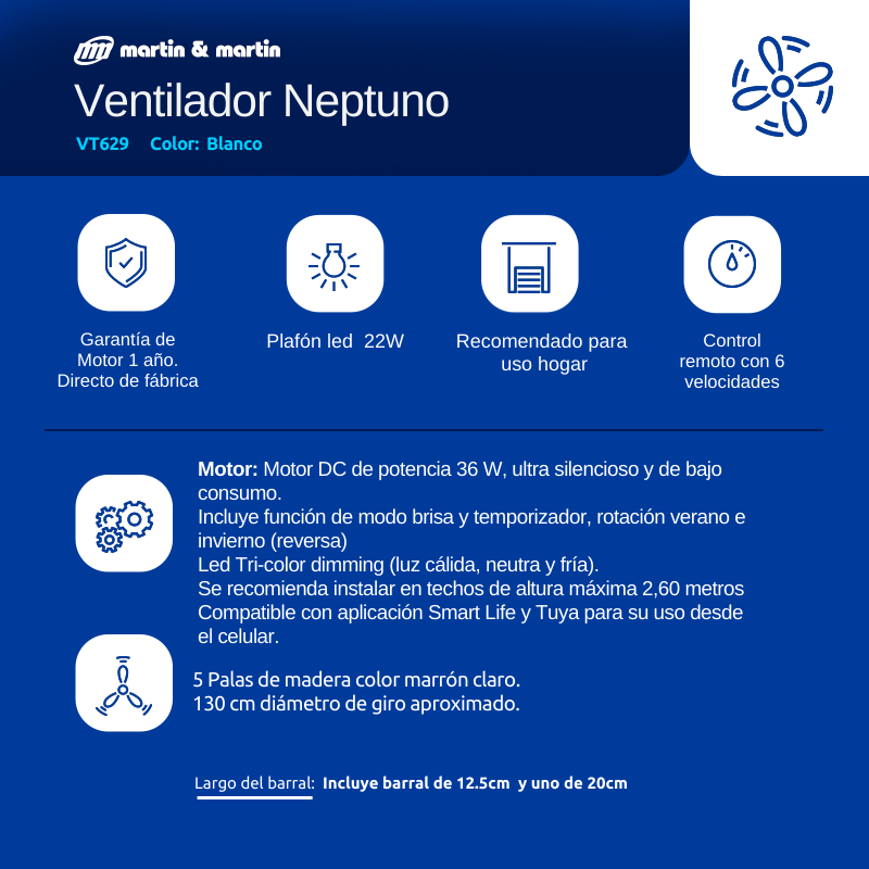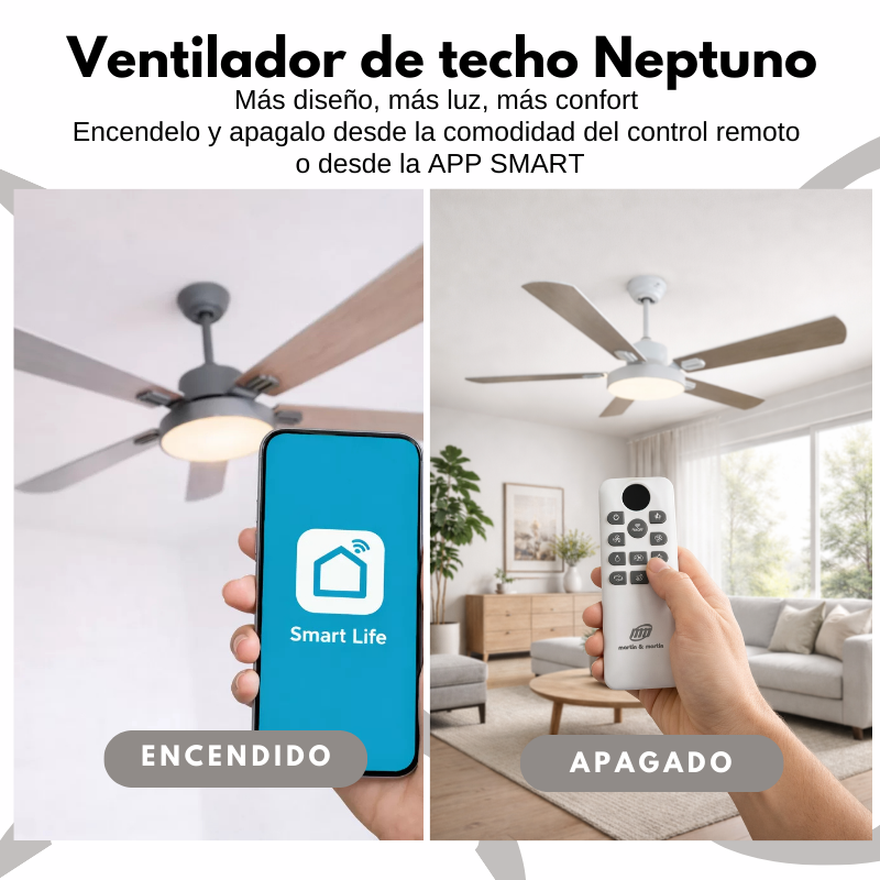 | CONTROL REMOTO Y APP CEL | Control remoto con 6 velocidades, incluye función modo brisa y temporizador, rotación verano e invierno (reversa) y compatible con la aplicación SMART para controlarlo desde el teléfono |