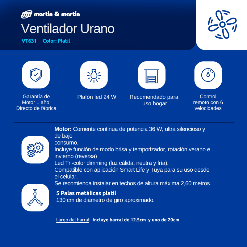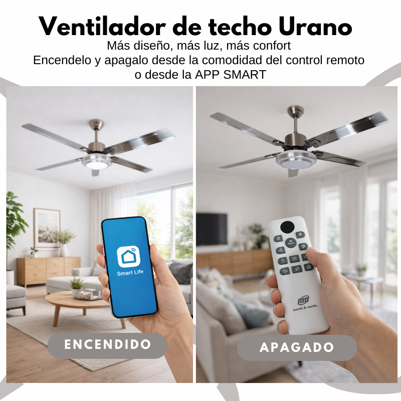 | CONTROL REMOTO Y APP CEL | Control remoto con 6 velocidades, incluye función modo brisa y temporizador, rotación verano e invierno (reversa) y compatible con la aplicación SMART para controlarlo desde el teléfono |